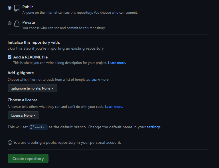 필자는 이미 해당 레퍼지토리를 만들었기 때문에 경고문이 나타난 것이니 걱정하지 말고 만들면 된다.